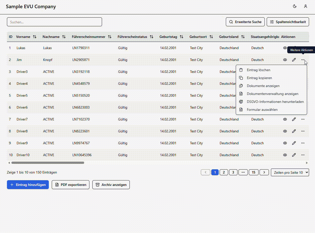 Neben dem bekannten Button zum Anzeigen der Dokumente des Triebfahrzeugführers, welcher die Dokumenten-Tabelle aufruft, befindet sich nun ein Button zur Dokumentenverwaltung des Triebahrzeugführers. Die sich öffnende Ansicht gibt einen Überblick zu allen vorhandenen Dokumenten des Tf und ermöglicht ebenso das Hinzufügen weiterer Dateien. Hier lässt sich auch das Gesamtpaket des Tf herunterladen.