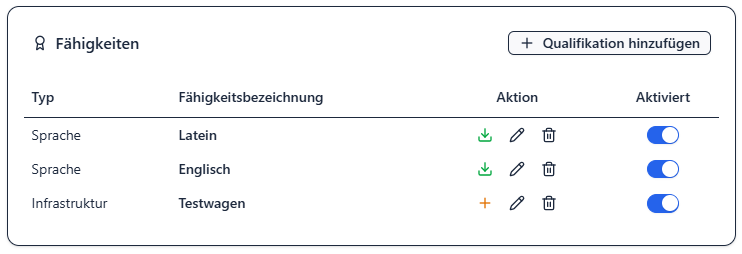 Im Stammdatenblatt finden Sie neben bestehenden Kenntnissen und Überwachungen nun entweder ein ➕, welches symbolisiert, dass zu dieser Kenntnis oder Überwachung noch kein Dokument hochgeladen wurde, oder ein Downloadsymbol, über welches das verknüpfte Dokument gedownloadet werden kann.