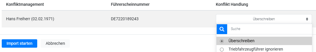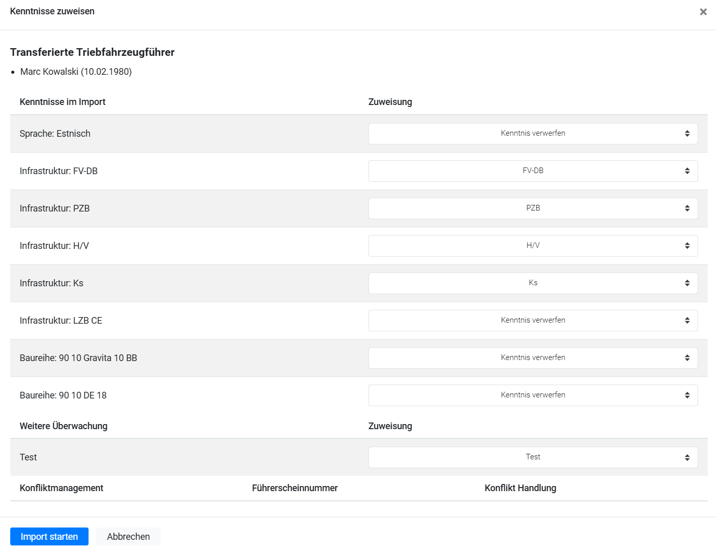 Sollte der transferierte und zu importierende Triebfahrzeugführer bereits existieren (Kriterium: Triebfahrzeugführerscheinnummer bereits in Ihrer Instanz vorhanden), wird dies im Bereich Konfliktmanagement angezeigt.
