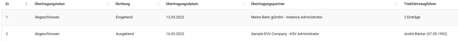 Der Menüpunkt Übertragungen bietet eine Übersicht aller durchgeführten Datenübertragungen zwischen RZBneo-Instanzen. Der Status der Übertragung, die Übertragungsrichtung (eingehend bzw. ausgehend), das Übertragungsdatum sowie der Übertragungspartner (Sender bzw. Empfänger) werden in der Tabelle dargestellt. Es ist zusätzlich einsehbar, welche Triebfahrzeugführer (bzw. deren Daten) übermittelt oder empfangen wurden.